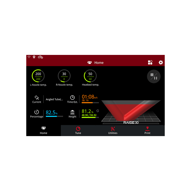 Pour garantir un résultat optimum, l'impression FDM nécessaite une première couche parfaite. RAISE équipe son modèle d'un système de contrôle automatique de votre plateau de façon à optimiserl'épaisseur de cette première couche et garantir ainsi, une excellente adhésion de celle-ci.