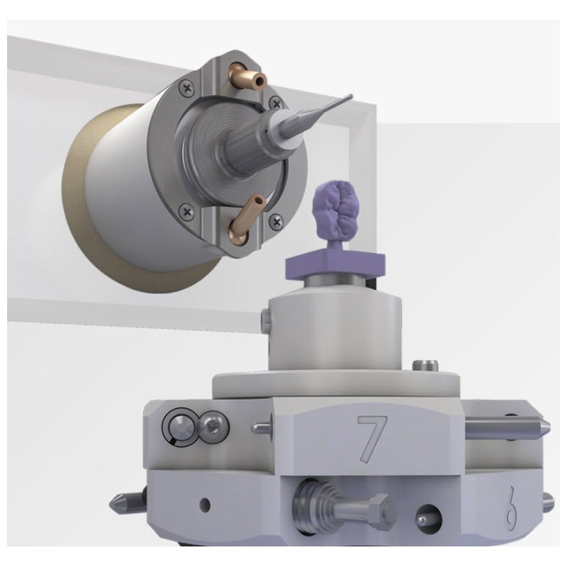 La R-One, version "matériaux tendres" de la gamme, se caractérise par une compacité intéressante pour vos cabinets dentaires. Elle possède une broche de 750 W usinant à 100 000 tr/mn et un chargeur de 7 outils. Elle permet de réaliser à la perfection vos Piliers, Inlays, Onlays et Facettes en Prémill Pré-usinés, Glass Céramic, ...
